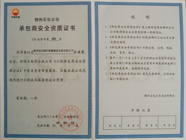 承包商安全資質(zhì)證書
